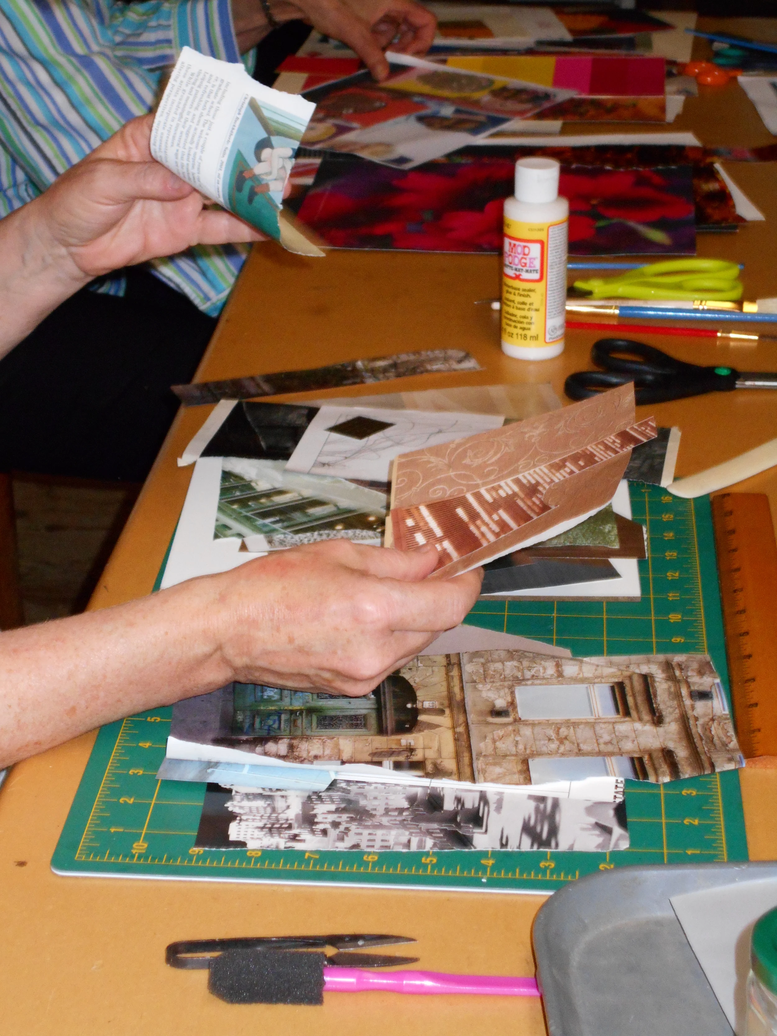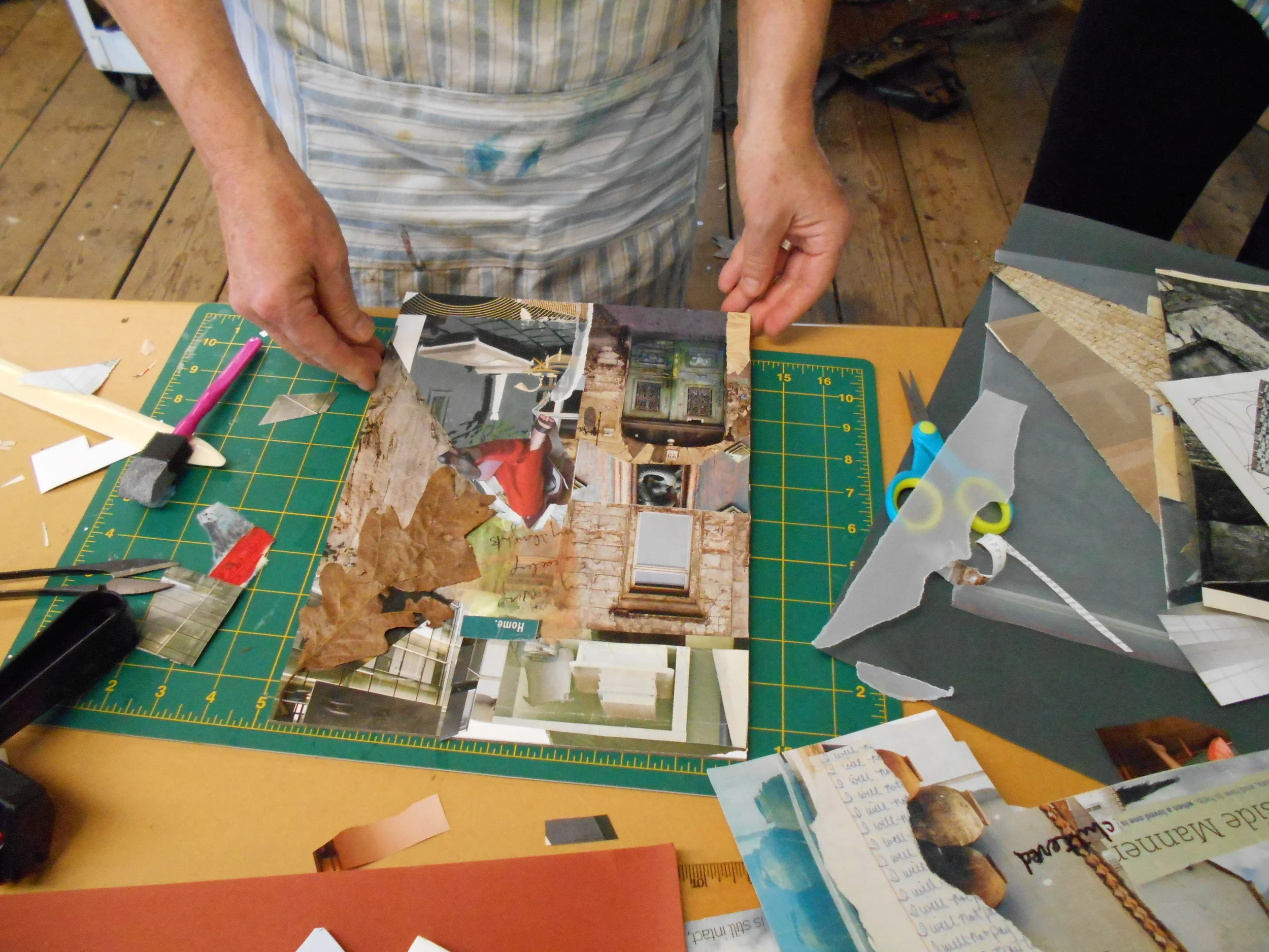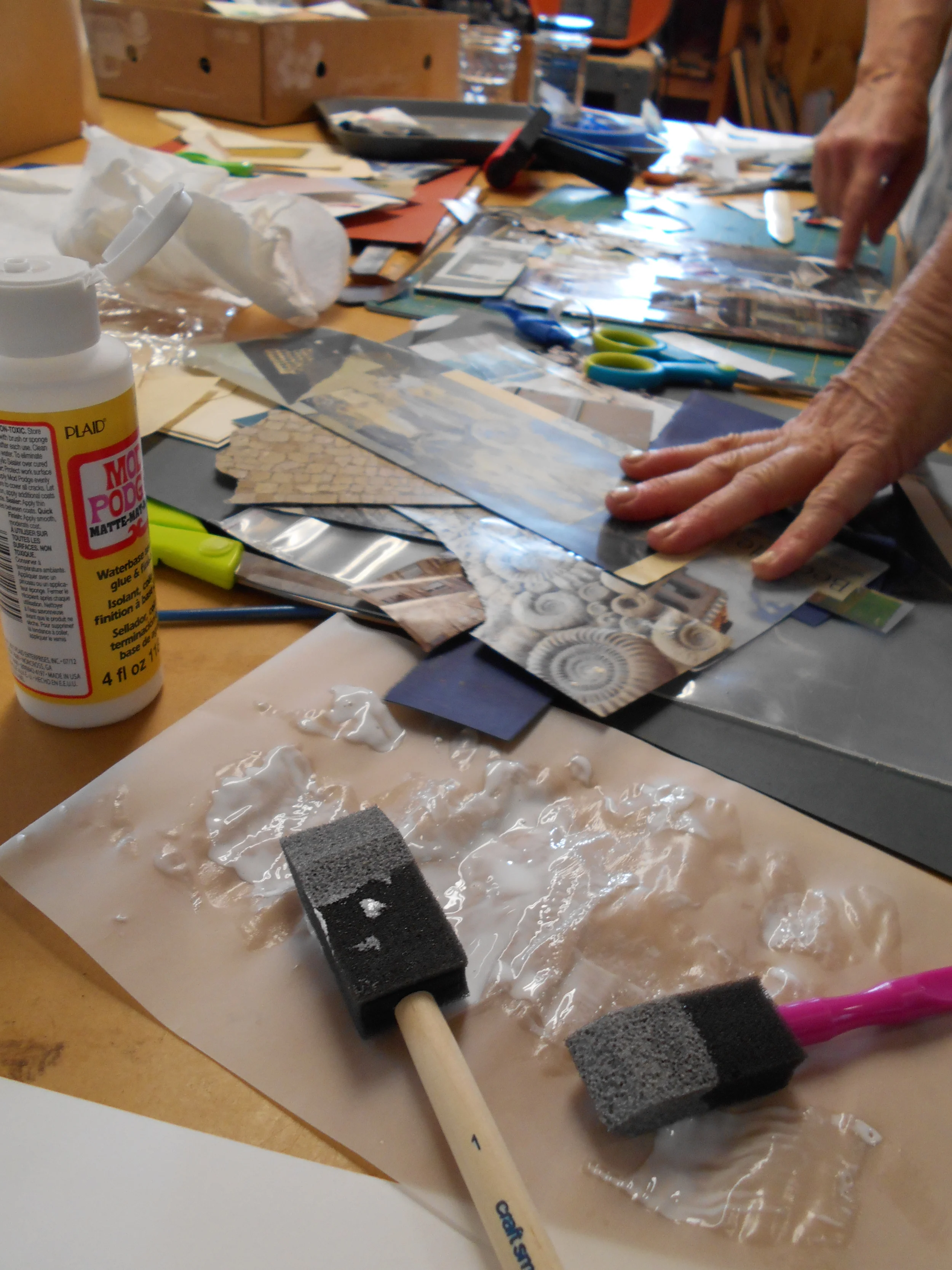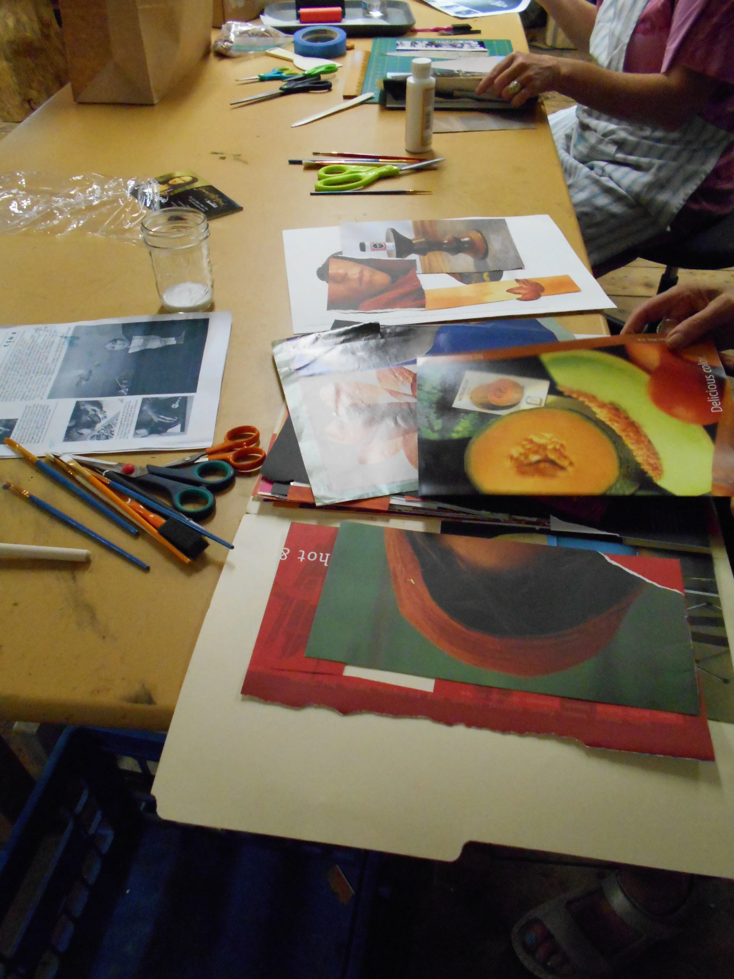 Artist and publisher (and OFPF Bounty Blogger) Lynn Horsky taught the art of collage on a summer Sunday that started with dramatic thunderstorms and ended with the bright sun and inspired participants.