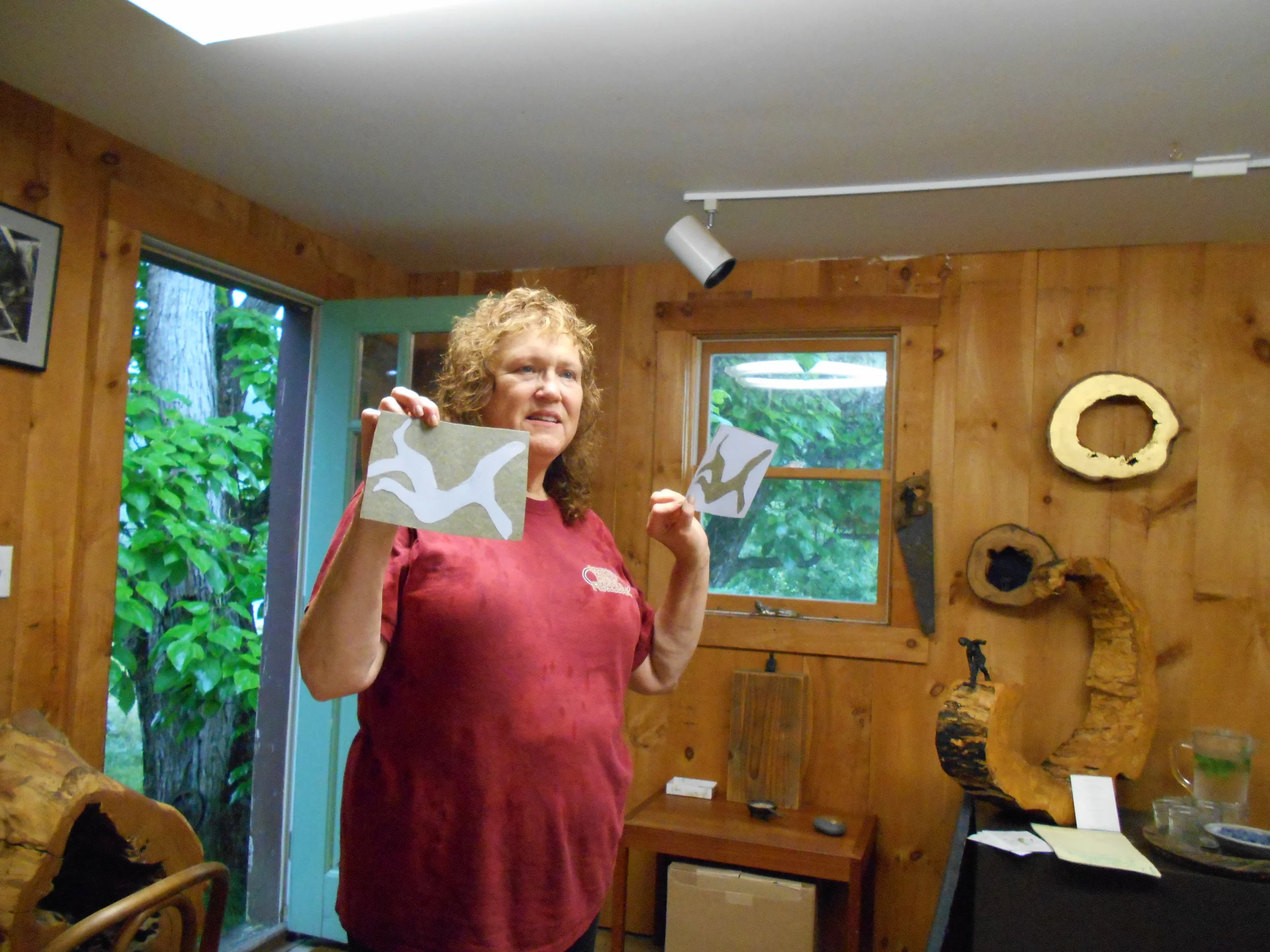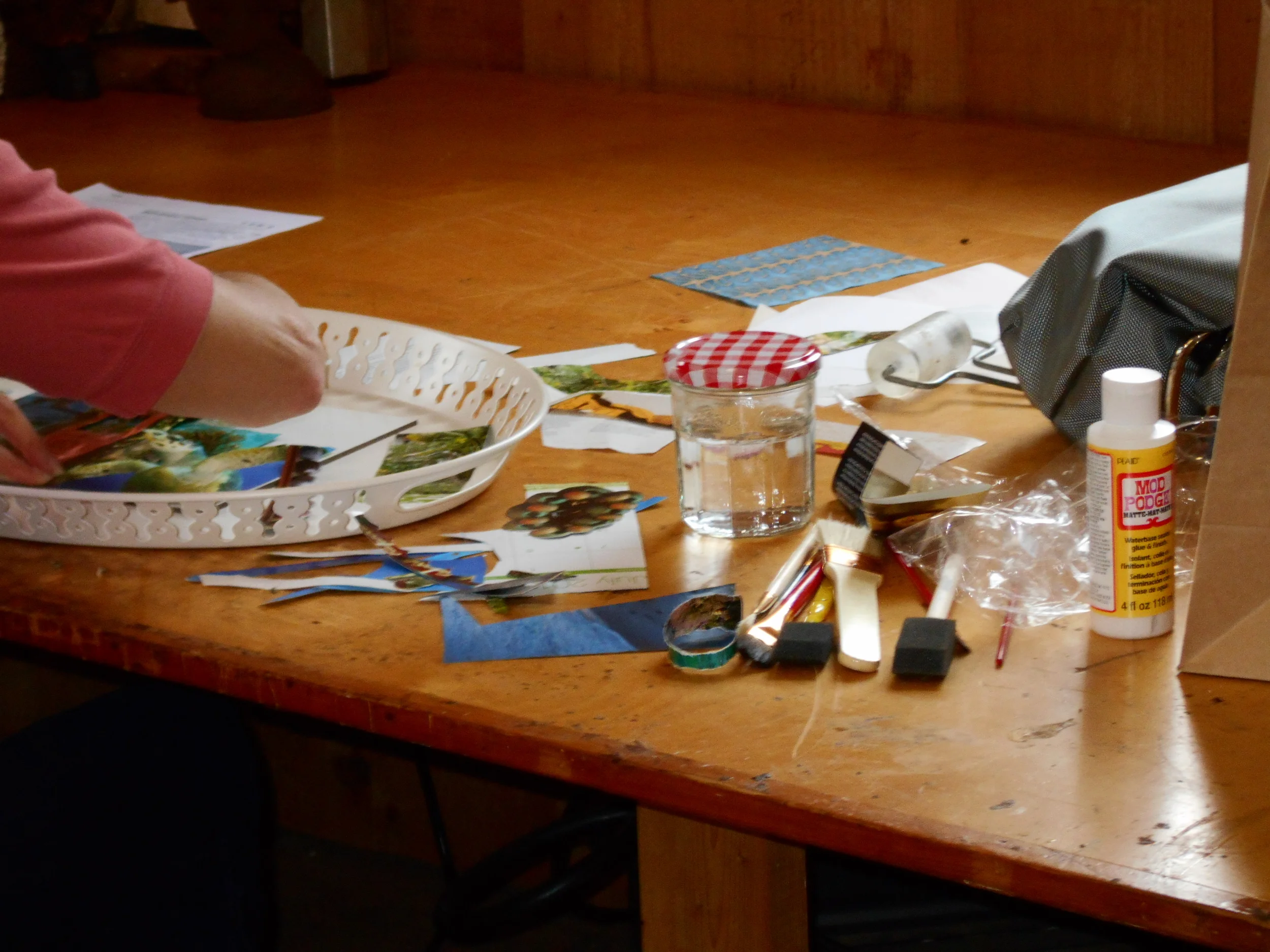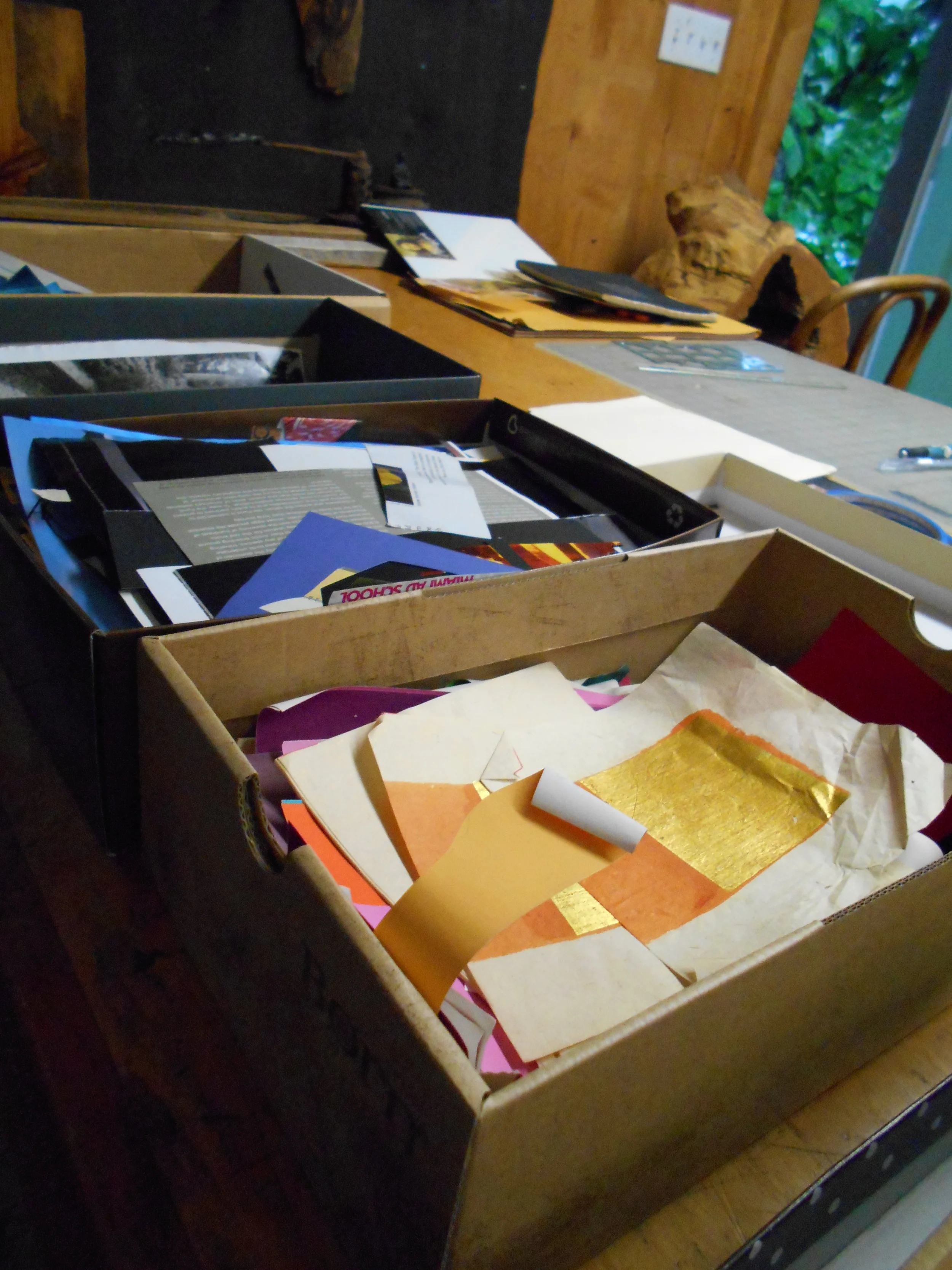 Artist and publisher (and OFPF Bounty Blogger) Lynn Horsky taught the art of collage on a summer Sunday that started with dramatic thunderstorms and ended with the bright sun and inspired participants.