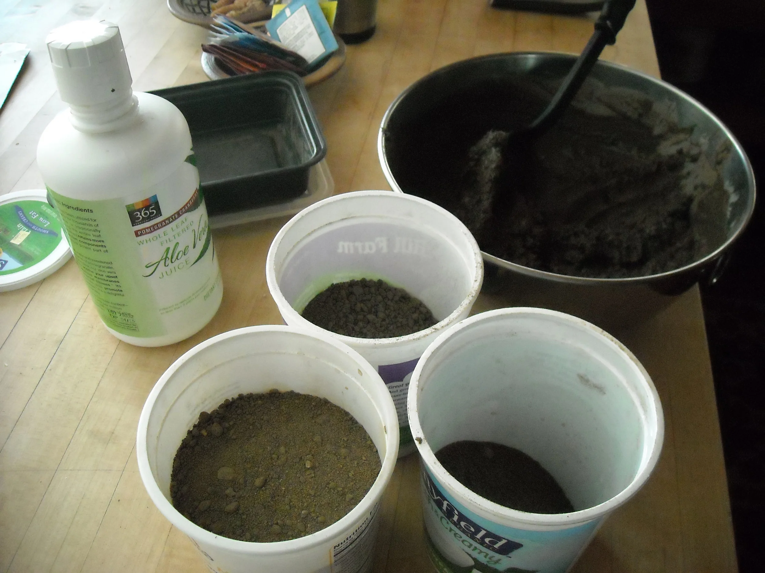 Applying the poultice of clay, healing aloe vera gel, and mineral-rich carbonatite.